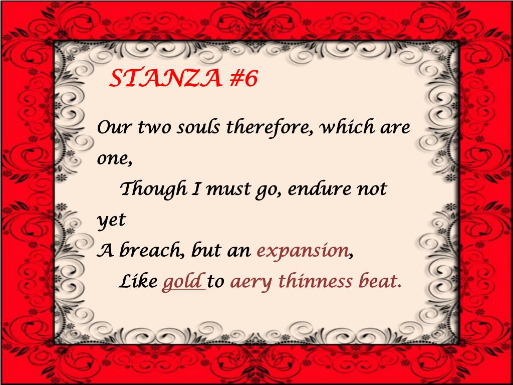 STANZA #6 Our two souls therefore, which are one, Though I must go, endure not yet A breach, but an expansion, Like gold to aery thinness beat.