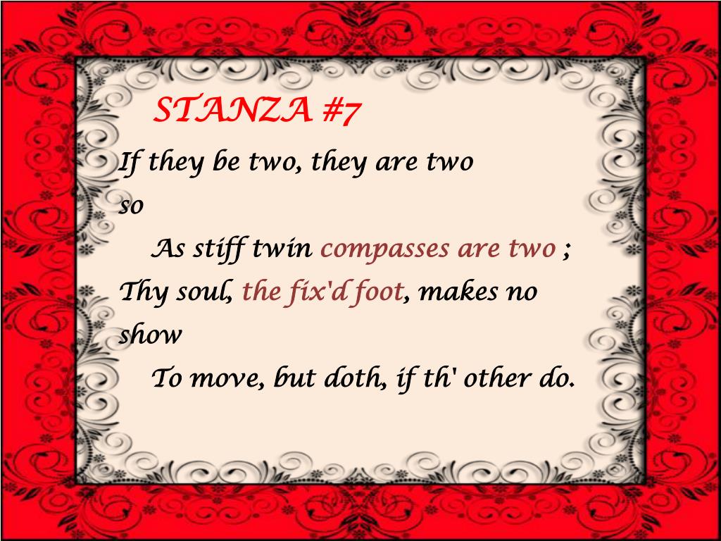 STANZA #7 If they be two, they are two so As stiff twin compasses are two ; Thy soul, the fix'd foot, makes no show To move, but doth, if th' other do.
