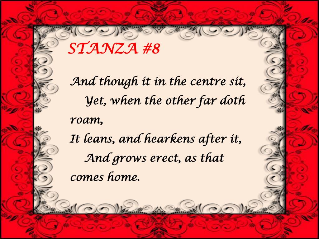 STANZA #8 And though it in the centre sit, Yet, when the other far doth roam, It leans, and hearkens after it, And grows erect, as that comes home.