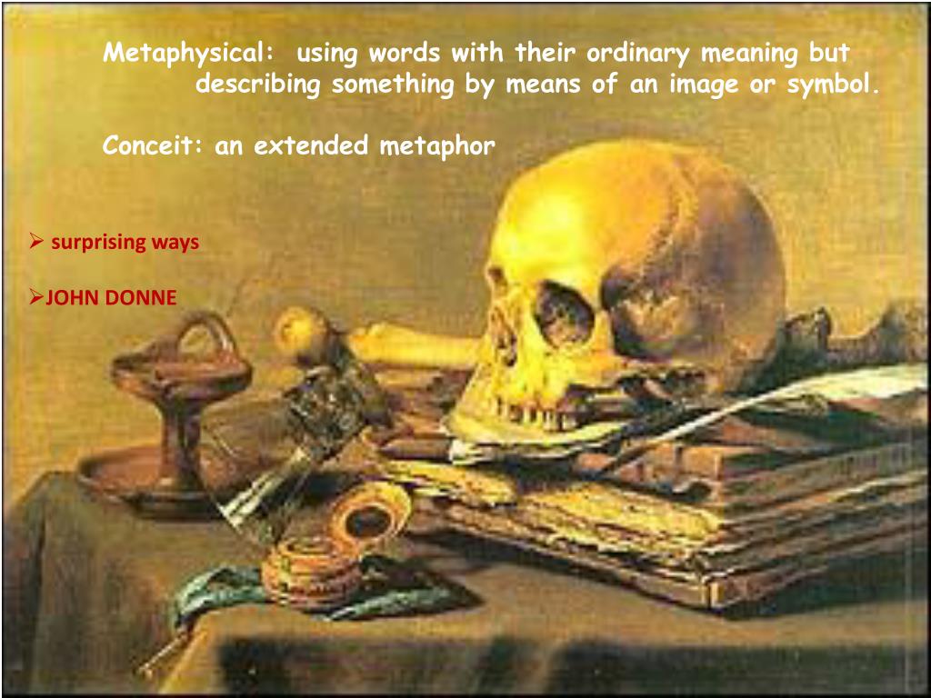 Metaphysical: usingwordswiththeirordinarymeaning but describingsomethingbymeans of an imageorsymbol.Conceit: an extendedmetaphor • surprisingways • JOHN DONNE