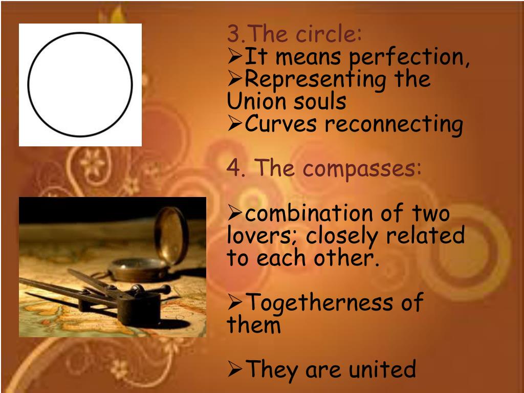 3.The circle: • It means perfection, • RepresentingtheUnionsouls • Curvesreconnecting 4. The compasses: • combination of two lovers; closely related to each other. • Togetherness of them • Theyareunited