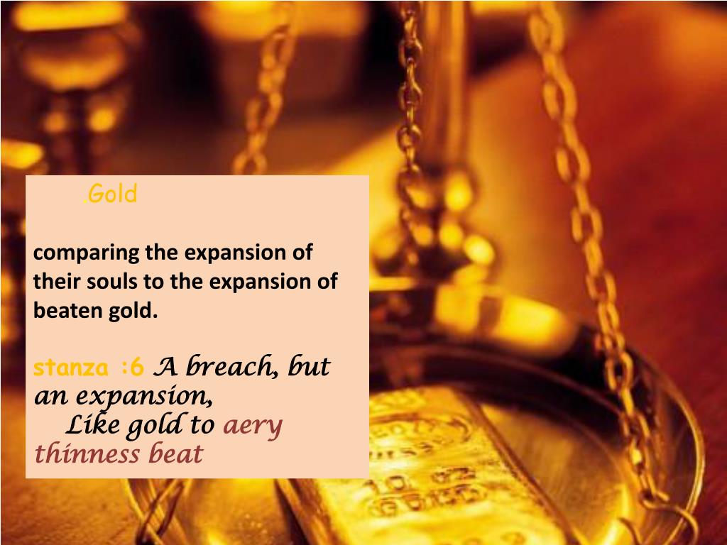 .Gold comparing the expansion of their souls to the expansion of beaten gold. stanza :6 A breach, but an expansion, Like gold to aery thinness beat