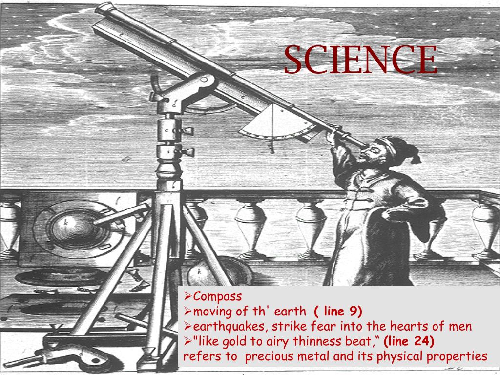 SCIENCE • Compass • moving of th' earth( line 9) • earthquakes, strikefearintothehearts of men • "likegoldtoairythinnessbeat,“ (line 24)referstoprecious metal anditsphysicalproperties
