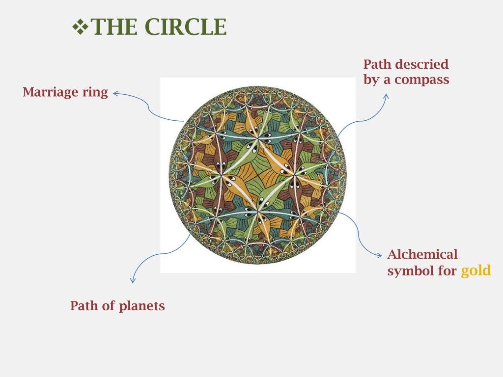 THE CIRCLE Pathdescriedby a compass Marriage ring Alchemicalsymbolforgold Path of planets