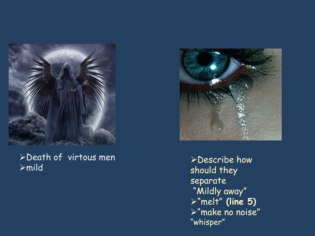 Death of virtous men • mild • Describehowshouldtheyseparate “Mildly away” • “melt” (line 5) • “make no noise”“whisper”