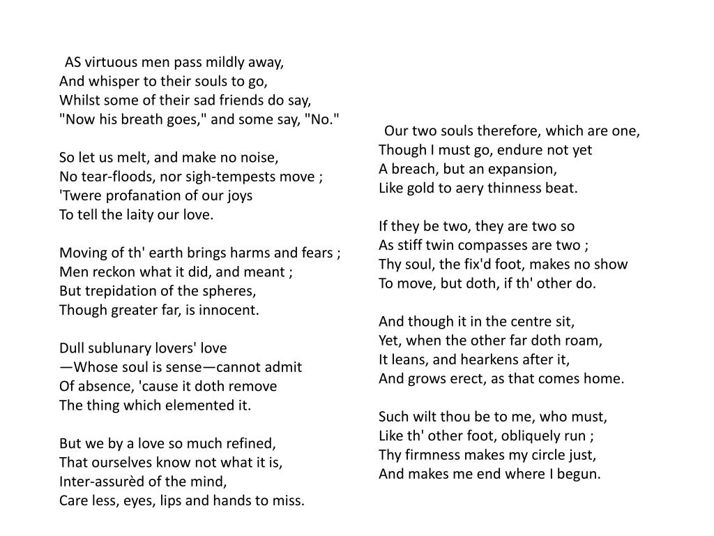 AS virtuous men pass mildly away, And whisper to their souls to go, Whilst some of their sad friends do say,"Now his breath goes," and some say, "No."So let us melt, and make no noise, No tear-floods, nor sigh-tempests move ;'Twere profanation of our joys To tell the laity our love. Moving of th' earth brings harms and fears ;Men reckon what it did, and meant ;But trepidation of the spheres, Though greater far, is innocent. Dull sublunary lovers' love —Whose soul is sense—cannot admit Of absence, 'cause it doth remove The thing which elemented it. But we by a love so much refined,That ourselves know not what it is, Inter-assurèd of the mind, Care less, eyes, lips and hands to miss. Our two souls therefore, which are one, Though I must go, endure not yet A breach, but an expansion, Like gold to aery thinness beat. If they be two, they are two so As stiff twin compasses are two ; Thy soul, the fix'd foot, makes no show To move, but doth, if th' other do. And though it in the centre sit, Yet, when the other far doth roam,It leans, and hearkens after it, And grows erect, as that comes home. Such wilt thou be to me, who must,Like th' other foot, obliquely run ;Thy firmness makes my circle just, And makes me end where I begun.