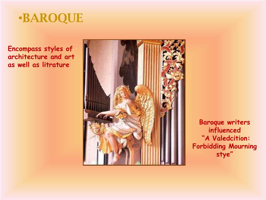 BAROQUE Encompassstyles of architectureand art as well as litrature Baroquewritersinfluenced “A Valedcition: ForbiddingMourningstye”