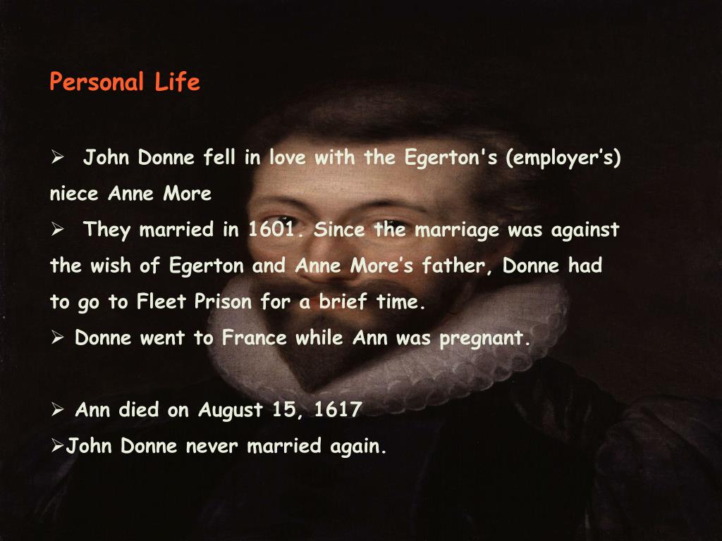 Personal Life • John Donnefell in lovewiththeEgerton's (employer’s) niece Anne More • Theymarried in 1601. Since themarriagewasagainstthewish of Egertonand Anne More’sfather, Donne had togotoFleetPrisonfor a brief time. • DonnewenttoFrancewhileAnnwaspregnant. • Anndied on August 15, 1617 • John Donnenevermarriedagain.