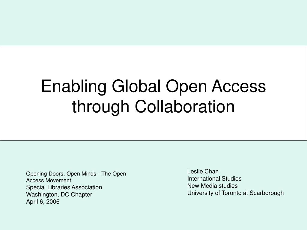 Enabling Global Open Access through Collaboration. Leslie Chan International Studies New Media studies University of Toronto at Scarborough. Opening Doors, Open Minds - The Open Access Movement Special Libraries Association Washington, DC Chapter April 6, 2006. Agenda. Motivations for OA