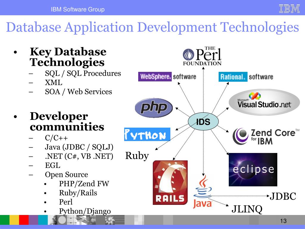 Database Application Development Technologies • Key Database Technologies • SQL / SQL Procedures • XML • SOA / Web Services • Developer communities • C/C++ • Java (JDBC / SQLJ) • .NET (C#, VB .NET) • EGL • Open Source • PHP/Zend FW • Ruby/Rails • Perl • Python/Django IDS Ruby JDBC JLINQ