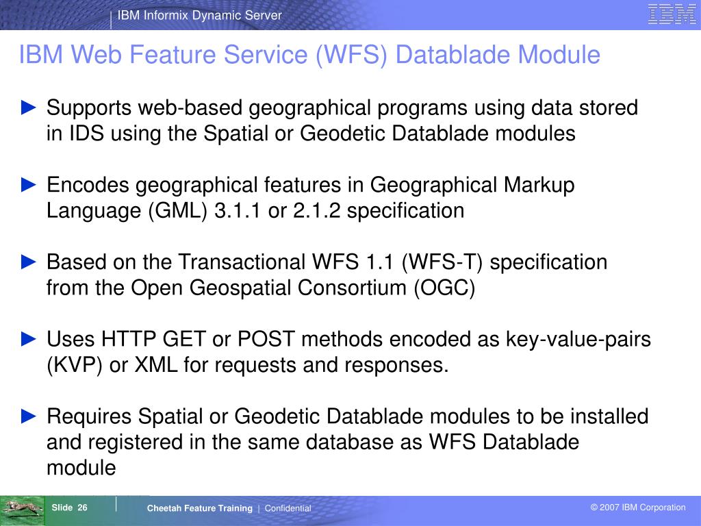 IBM Web Feature Service (WFS) Datablade Module • Supports web-based geographical programs using data stored in IDS using the Spatial or Geodetic Datablade modules • Encodes geographical features in Geographical Markup Language (GML) 3.1.1 or 2.1.2 specification • Based on the Transactional WFS 1.1 (WFS-T) specification from the Open Geospatial Consortium (OGC) • Uses HTTP GET or POST methods encoded as key-value-pairs (KVP) or XML for requests and responses. • Requires Spatial or Geodetic Datablade modules to be installed and registered in the same database as WFS Datablade module