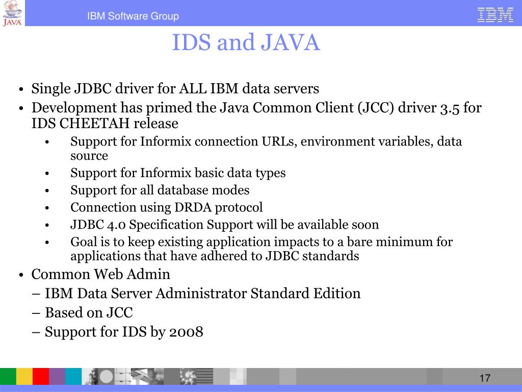 IDS and JAVA • Single JDBC driver for ALL IBM data servers • Development has primed the Java Common Client (JCC) driver 3.5 for IDS CHEETAH release • Support for Informix connection URLs, environment variables, data source • Support for Informix basic data types • Support for all database modes • Connection using DRDA protocol • JDBC 4.0 Specification Support will be available soon • Goal is to keep existing application impacts to a bare minimum for applications that have adhered to JDBC standards • Common Web Admin • IBM Data Server Administrator Standard Edition • Based on JCC • Support for IDS by 2008