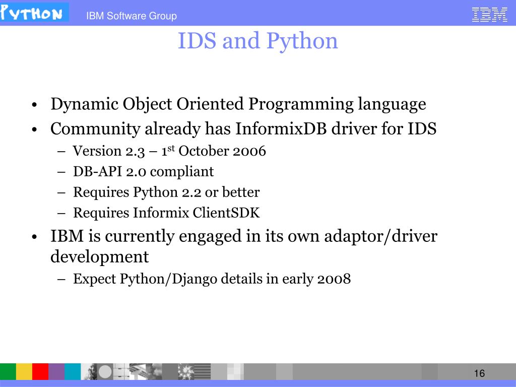 IDS and Python • Dynamic Object Oriented Programming language • Community already has InformixDB driver for IDS • Version 2.3 – 1st October 2006 • DB-API 2.0 compliant • Requires Python 2.2 or better • Requires Informix ClientSDK • IBM is currently engaged in its own adaptor/driver development • Expect Python/Django details in early 2008