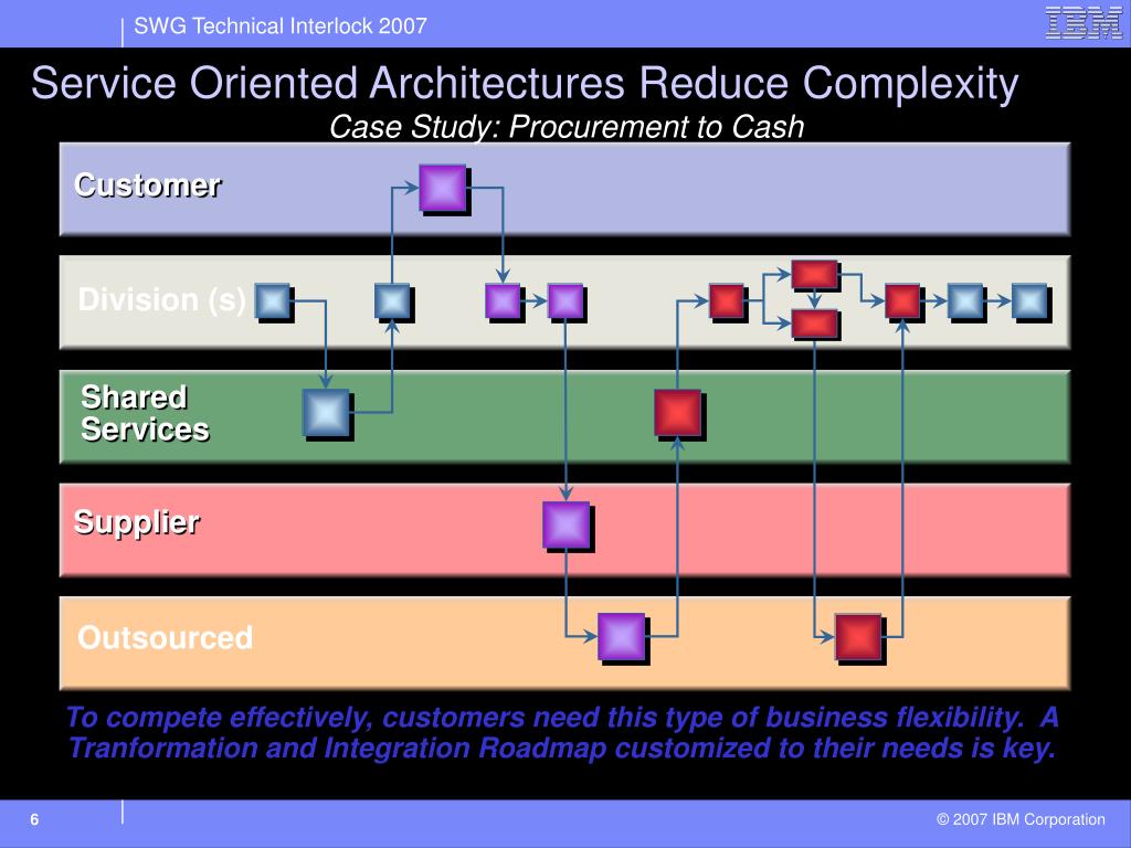 Case Study: Procurement to Cash Service Oriented Architectures Reduce Complexity Customer Division (s) Shared Services Supplier Outsourced To compete effectively, customers need this type of business flexibility. A Tranformation and Integration Roadmap customized to their needs is key.