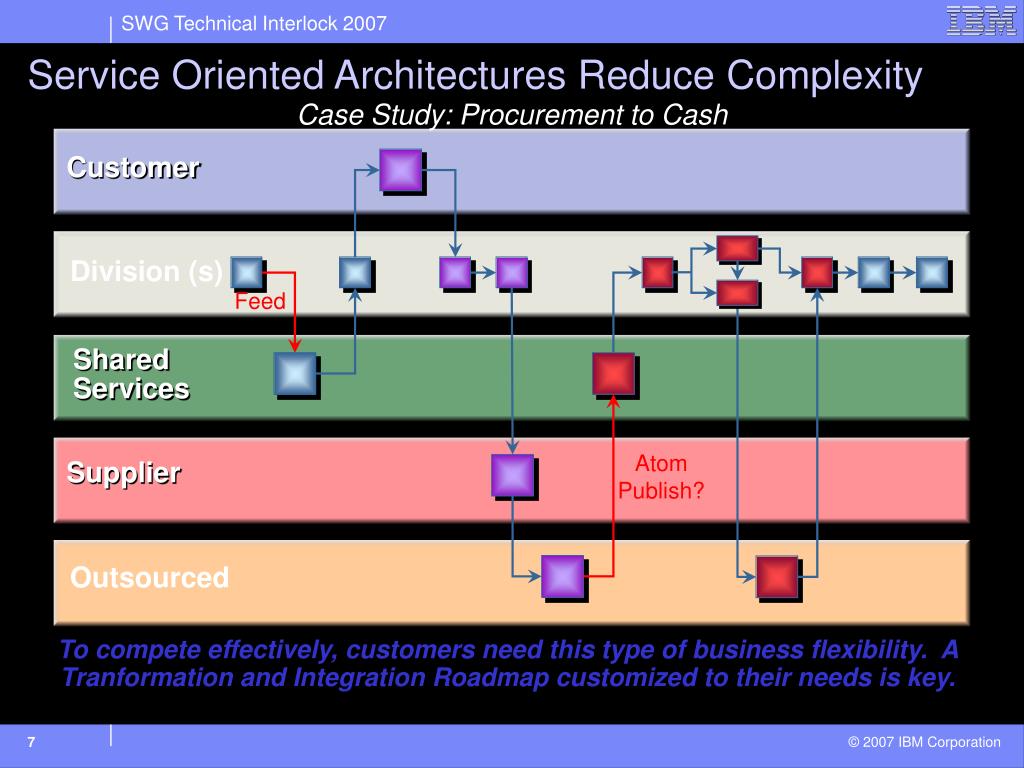 Case Study: Procurement to Cash Service Oriented Architectures Reduce Complexity Customer Division (s) Feed Shared Services Atom Publish? Supplier Outsourced To compete effectively, customers need this type of business flexibility. A Tranformation and Integration Roadmap customized to their needs is key.
