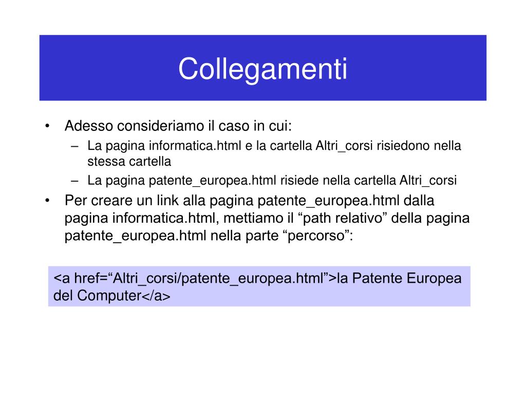 Collegamenti • Adesso consideriamo il caso in cui: • La pagina informatica.html e la cartella Altri_corsi risiedono nella stessa cartella • La pagina patente_europea.html risiede nella cartella Altri_corsi • Per creare un link alla pagina patente_europea.html dalla pagina informatica.html, mettiamo il “path relativo” della pagina patente_europea.html nella parte “percorso”: <a href=“Altri_corsi/patente_europea.html”>la Patente Europea del Computer</a>