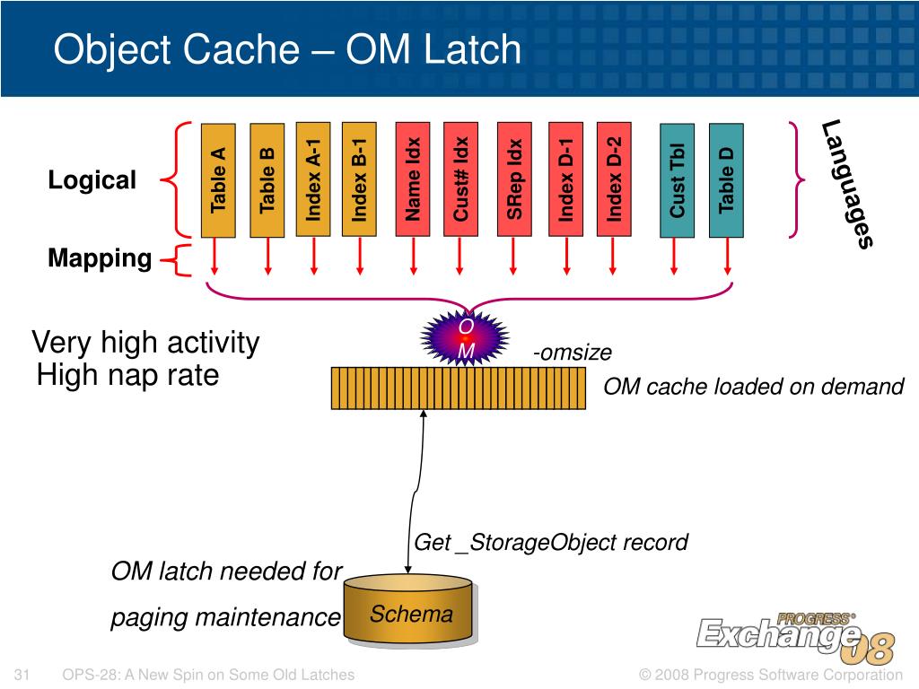 Logical Index A-1 Index B-1 Name Idx Cust# Idx SRep Idx Index D-1 Index D-2 Table B Table D Table A Cust Tbl Very high activity High nap rate Object Cache – OM Latch Languages Mapping OM -omsize OM cache loaded on demand Get _StorageObject record OM latch needed for paging maintenance Schema OPS-28: A New Spin on Some Old Latches