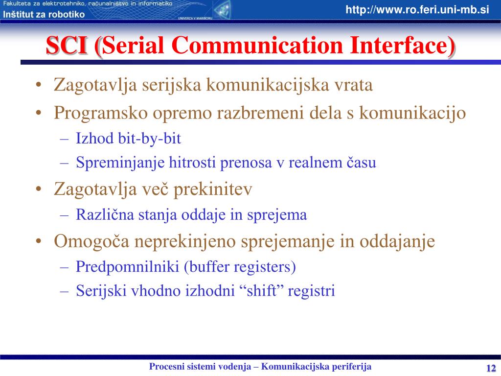 SCI (Serial Communication Interface) • Zagotavlja serijska komunikacijska vrata • Programsko opremo razbremeni dela s komunikacijo • Izhod bit-by-bit • Spreminjanje hitrosti prenosa v realnem času • Zagotavlja več prekinitev • Različna stanja oddaje in sprejema • Omogoča neprekinjeno sprejemanje in oddajanje • Predpomnilniki (buffer registers) • Serijski vhodno izhodni “shift” registri Procesni sistemi vodenja – Komunikacijska periferija