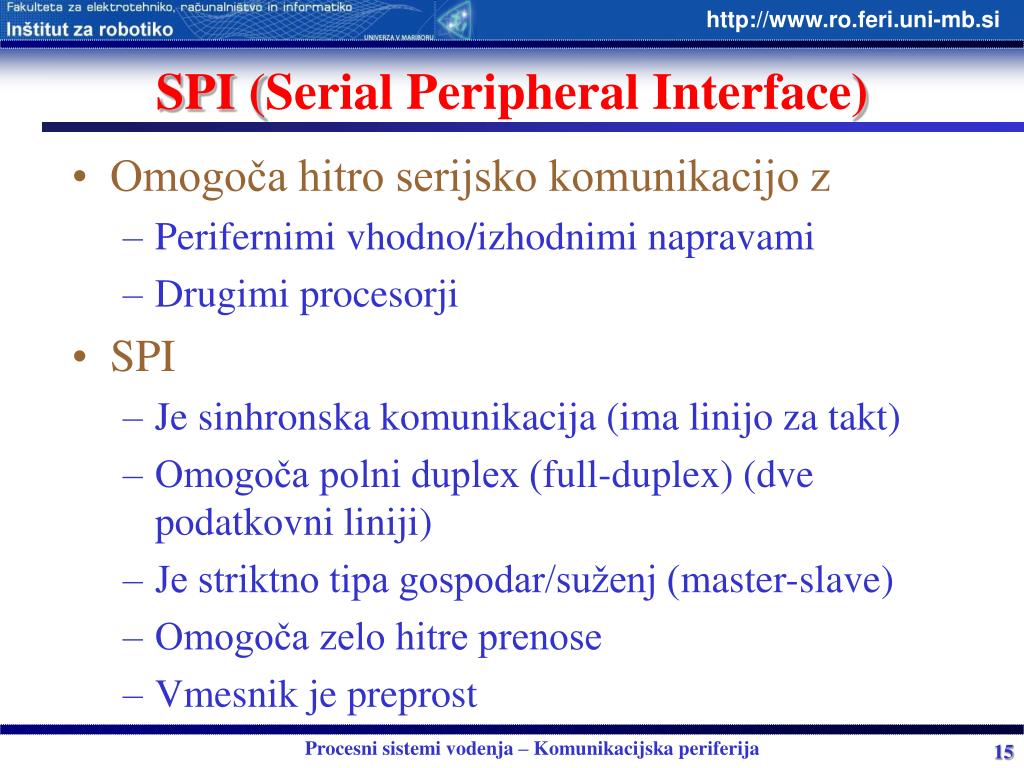 SPI (Serial Peripheral Interface) • Omogoča hitro serijsko komunikacijo z • Perifernimi vhodno/izhodnimi napravami • Drugimi procesorji • SPI • Je sinhronska komunikacija (ima linijo za takt) • Omogoča polni duplex (full-duplex) (dve podatkovni liniji) • Je striktno tipa gospodar/suženj (master-slave) • Omogoča zelo hitre prenose • Vmesnik je preprost Procesni sistemi vodenja – Komunikacijska periferija