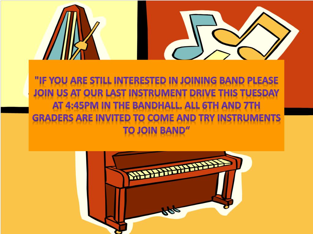 "if you are still interested in joining band please join us at our last instrument drive this Tuesday at 4:45pm in the bandhall. All 6th and 7th graders are invited to come and try instruments to join band“