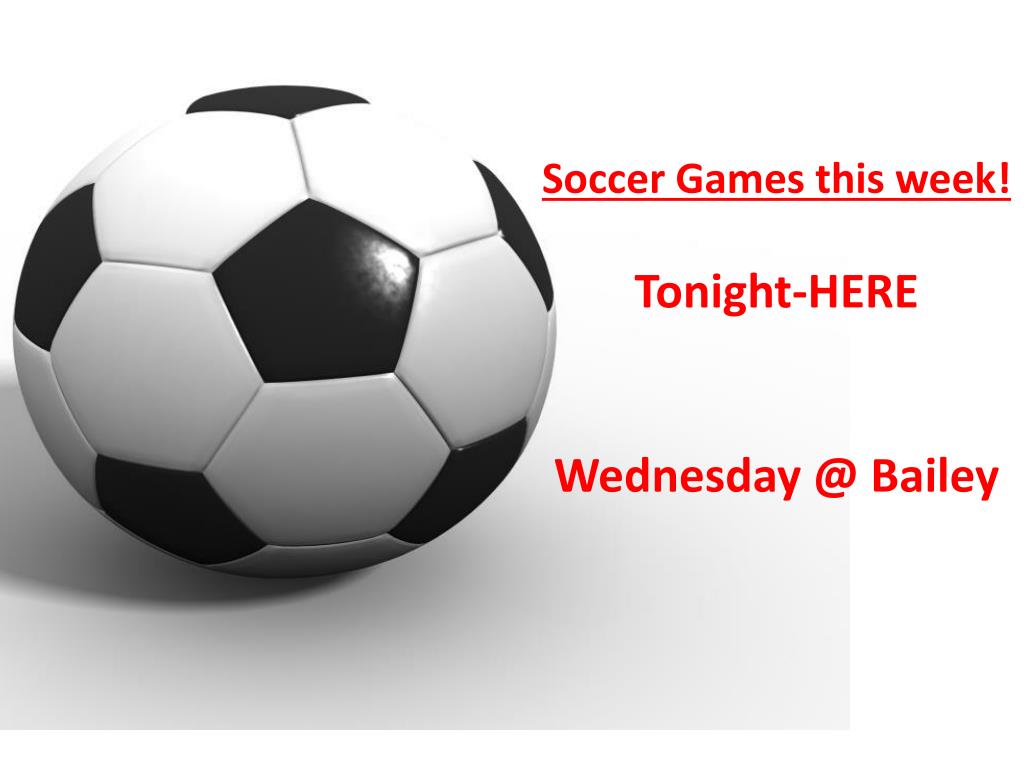 Soccer Games this week! Tonight-HERE Wednesday @ Bailey