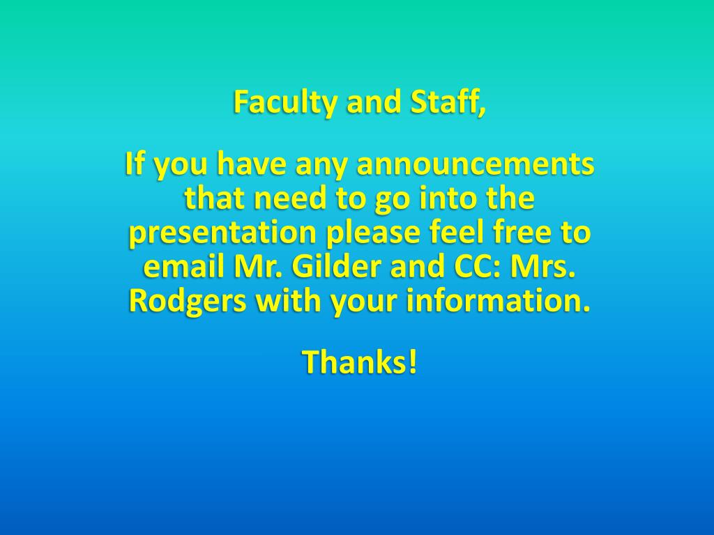 Faculty and Staff, If you have any announcements that need to go into the presentation please feel free to email Mr. Gilder and CC: Mrs. Rodgers with your information. Thanks!