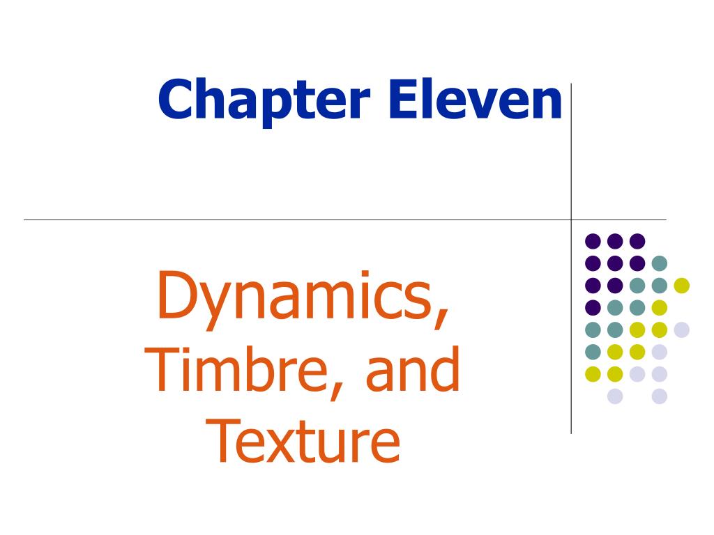 Chapter Eleven. Dynamics, Timbre, and Texture. Basic Elements of Music. Rhythm Melody (pitch) Harmony Timbre (sound) Dynamics Texture Form (shape). Dynamics. Dynamics are the relative volume of sound and are measured in decibels.