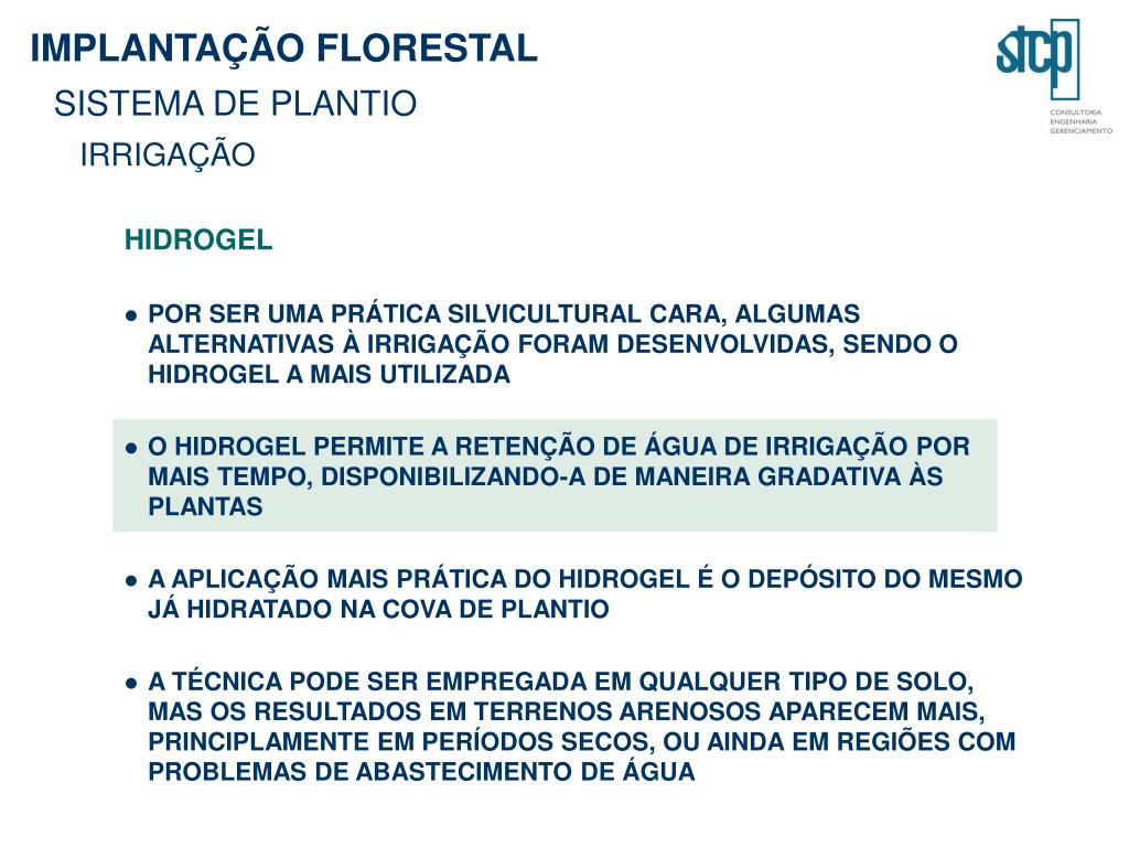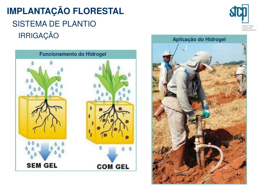 Aplicação do Hidrogel Funcionamento do Hidrogel IMPLANTAÇÃO FLORESTAL SISTEMA DE PLANTIO IRRIGAÇÃO