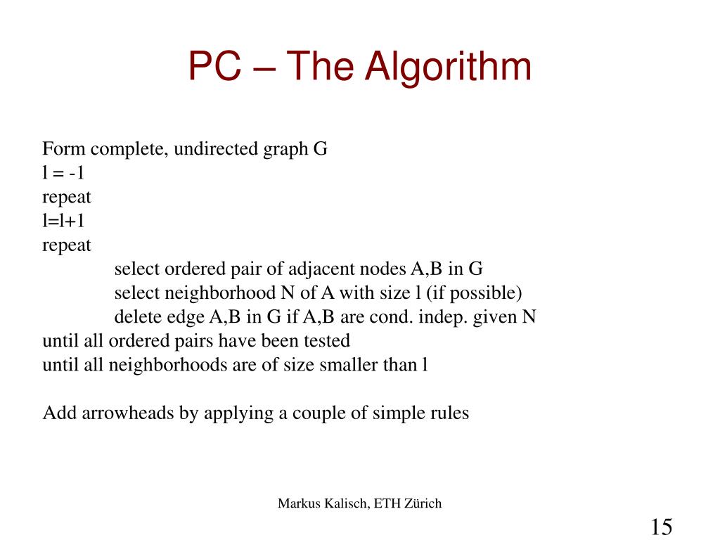 PC – The idea • Start: Complete, undirected graph • Recursive conditional independence testsfor deleting edges • Afterwards: Add arrowheads • In theory (asymptotic): Correct equivalence class is found Markus Kalisch, ETH Zürich 14