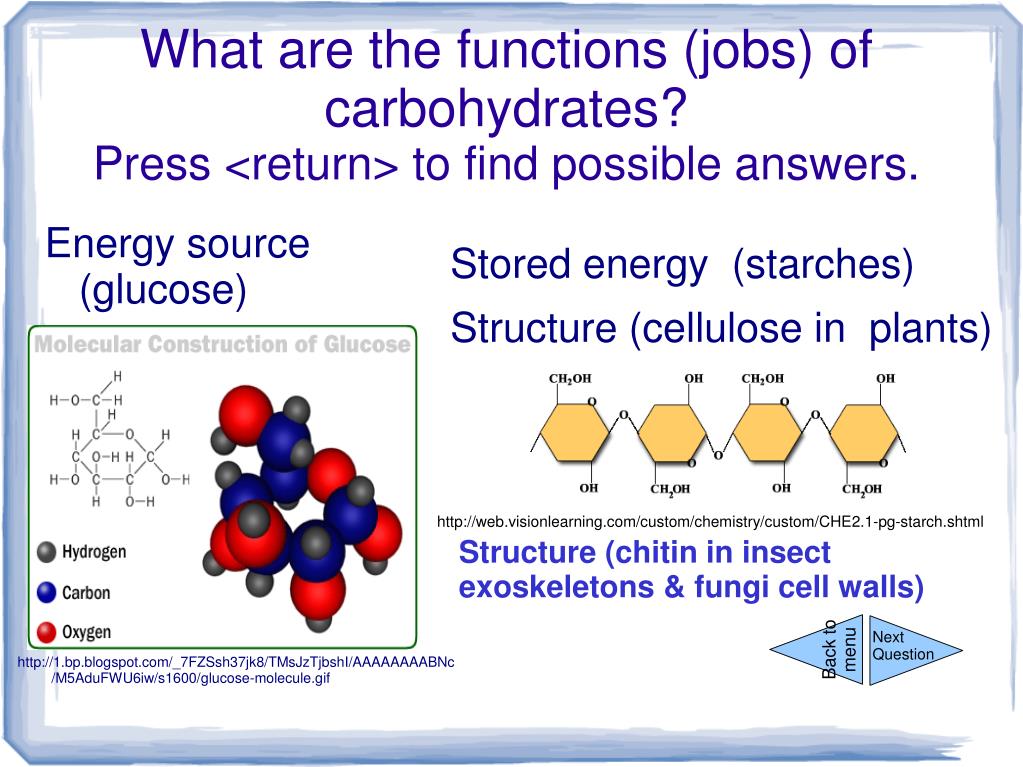 What are the functions (jobs) of carbohydrates?Press <return> to find possible answers. Energy source (glucose) http://1.bp.blogspot.com/_7FZSsh37jk8/TMsJzTjbshI/AAAAAAAABNc/M5AduFWU6iw/s1600/glucose-molecule.gif Stored energy (starches) Structure (cellulose in plants) http://web.visionlearning.com/custom/chemistry/custom/CHE2.1-pg-starch.shtml Structure (chitin in insect exoskeletons & fungi cell walls) Back to menu Next Question
