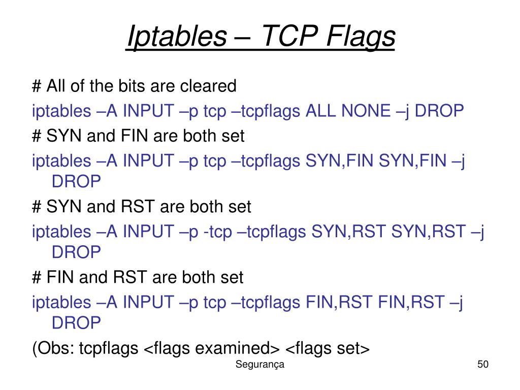 Iptables – TCP Flags # All of the bits are cleared iptables –A INPUT –p tcp –tcpflags ALL NONE –j DROP # SYN and FIN are both set iptables –A INPUT –p tcp –tcpflags SYN,FIN SYN,FIN –j DROP # SYN and RST are both set iptables –A INPUT –p -tcp –tcpflags SYN,RST SYN,RST –j DROP # FIN and RST are both set iptables –A INPUT –p tcp –tcpflags FIN,RST FIN,RST –j DROP (Obs: tcpflags <flags examined> <flags set> Segurança