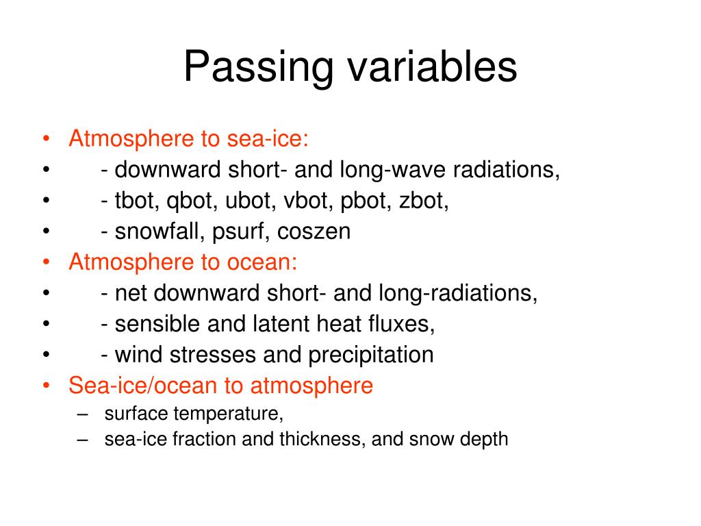 Passing variables • Atmosphere to sea-ice: • - downward short- and long-wave radiations, • - tbot, qbot, ubot, vbot, pbot, zbot, • - snowfall, psurf, coszen • Atmosphere to ocean: • - net downward short- and long-radiations, • - sensible and latent heat fluxes, • - wind stresses and precipitation • Sea-ice/ocean to atmosphere • surface temperature, • sea-ice fraction and thickness, and snow depth