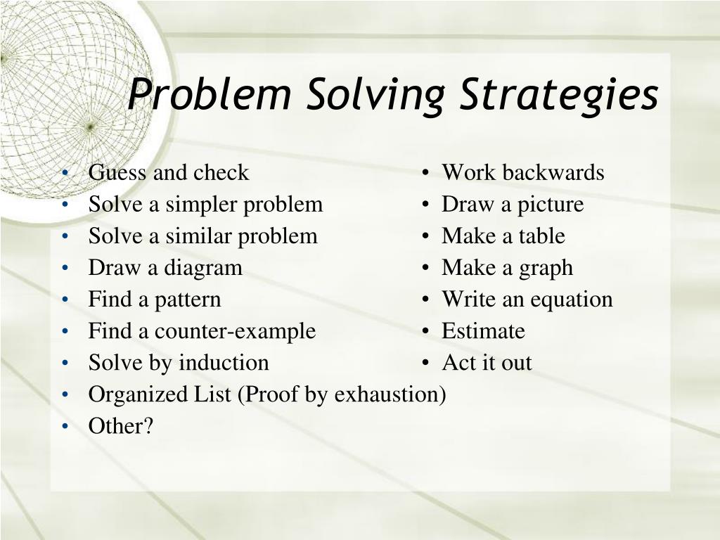 Problem Solving Strategies • Guess and check • Work backwards • Solve a simpler problem • Draw a picture • Solve a similar problem • Make a table • Draw a diagram • Make a graph • Find a pattern • Write an equation • Find a counter-example • Estimate • Solve by induction • Act it out • Organized List (Proof by exhaustion) • Other?