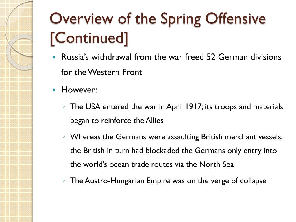 Overview of the Spring Offensive [Continued] • Russia’s withdrawal from the war freed 52 German divisions for the Western Front • However: • The USA entered the war in April 1917; its troops and materials began to reinforce the Allies • Whereas the Germans were assaulting British merchant vessels, the British in turn had blockaded the Germans only entry into the world’s ocean trade routes via the North Sea • The Austro-Hungarian Empire was on the verge of collapse