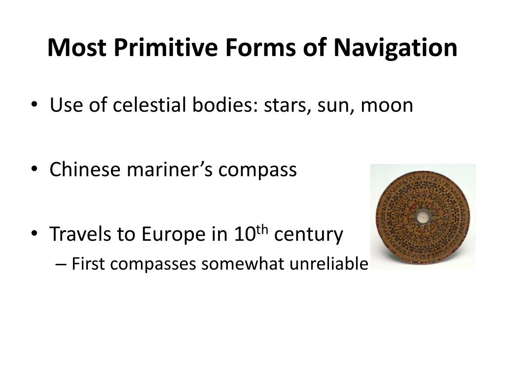 Most Primitive Forms of Navigation • Use of celestial bodies: stars, sun, moon • Chinese mariner’s compass • Travels to Europe in 10th century • First compasses somewhat unreliable