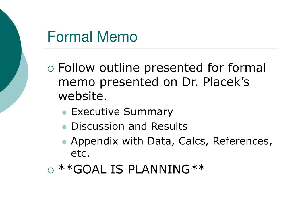 Formal Memo • Follow outline presented for formal memo presented on Dr. Placek’s website. • Executive Summary • Discussion and Results • Appendix with Data, Calcs, References, etc. • **GOAL IS PLANNING**