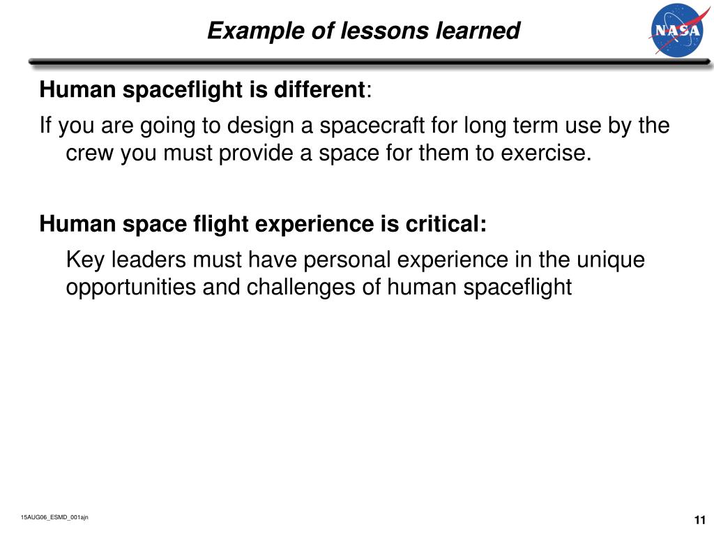 Example of lessons learned Human spaceflight is different: If you are going to design a spacecraft for long term use by the crew you must provide a space for them to exercise. Human space flight experience is critical: Key leaders must have personal experience in the unique opportunities and challenges of human spaceflight