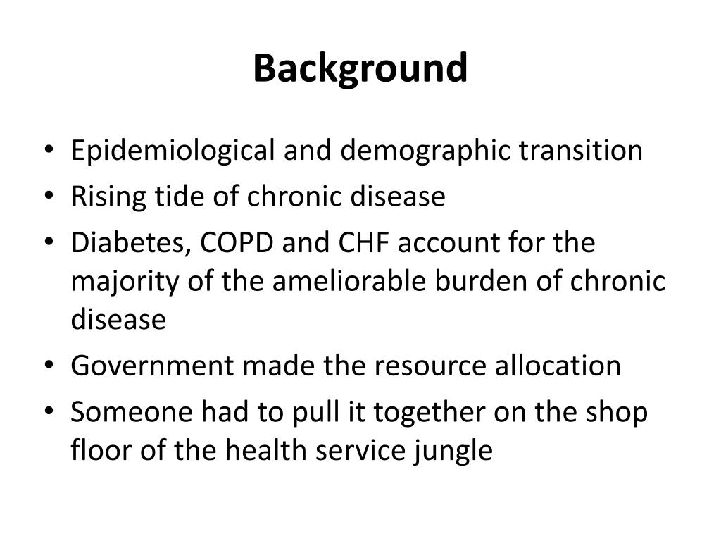 Background • Epidemiological and demographic transition • Rising tide of chronic disease • Diabetes, COPD and CHF account for the majority of the ameliorable burden of chronic disease • Government made the resource allocation • Someone had to pull it together on the shop floor of the health service jungle