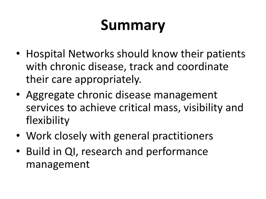 Summary • Hospital Networks should know their patients with chronic disease, track and coordinate their care appropriately. • Aggregate chronic disease management services to achieve critical mass, visibility and flexibility • Work closely with general practitioners • Build in QI, research and performance management