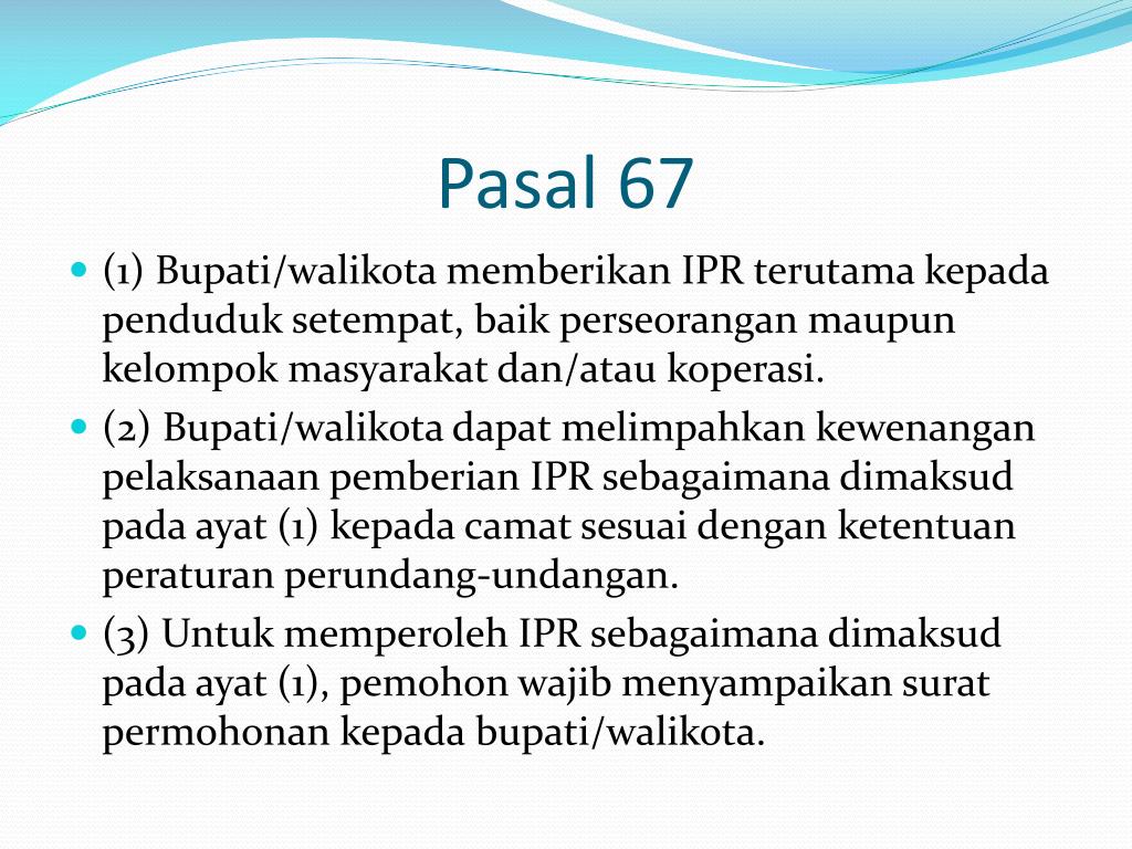 Pasal 67 • (1) Bupati/walikotamemberikan IPR terutamakepadapenduduk setempat, baik perseorangan maupun kelompokmasyarakatdan/ataukoperasi. • (2) Bupati/walikotadapatmelimpahkankewenanganpelaksanaanpemberian IPR sebagaimanadimaksudpadaayat (1) kepadacamatsesuaidenganketentuanperaturanperundang-undangan. • (3) Untukmemperoleh IPR sebagaimanadimaksudpadaayat(1), pemohon wajib menyampaikan surat permohonan kepadabupati/walikota.