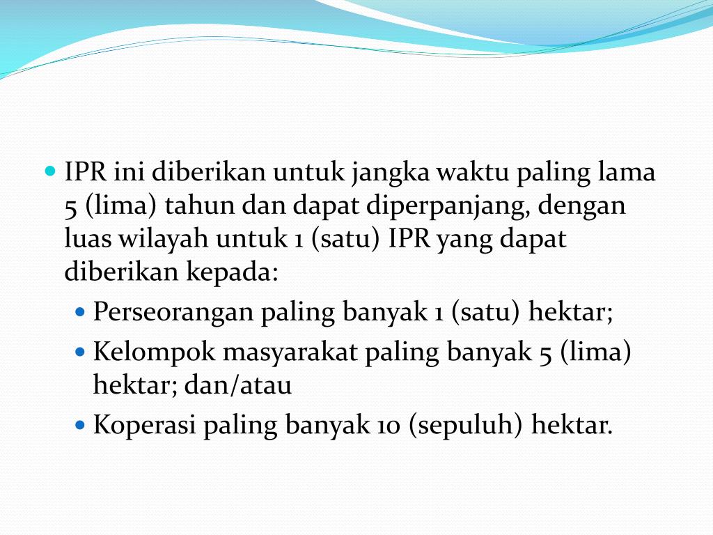 IPR ini diberikan untuk jangka waktu paling lama 5 (lima) tahun dan dapat diperpanjang, dengan luas wilayah untuk 1 (satu) IPR yang dapat diberikan kepada: • Perseorangan paling banyak 1 (satu) hektar; • Kelompok masyarakat paling banyak 5 (lima) hektar; dan/atau • Koperasi paling banyak 10 (sepuluh) hektar.