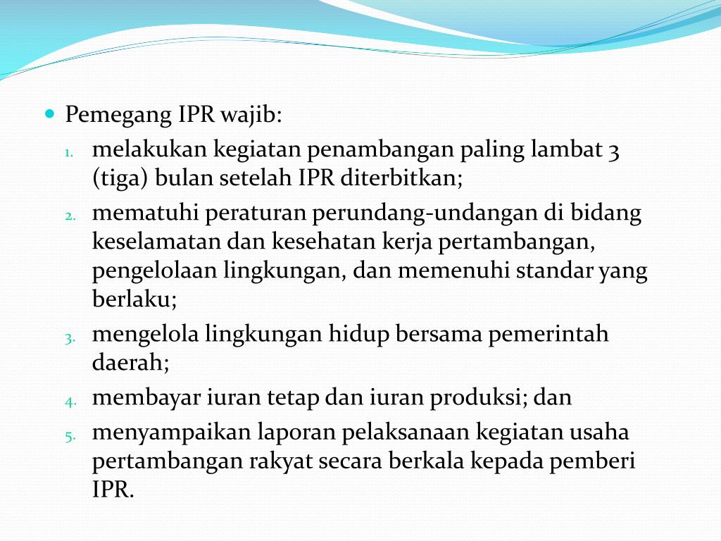 Pemegang IPR wajib: • melakukan kegiatan penambangan paling lambat 3 (tiga) bulan setelah IPR diterbitkan; • mematuhi peraturan perundang-undangan di bidang keselamatan dan kesehatan kerja pertambangan, pengelolaan lingkungan, dan memenuhi standar yang berlaku; • mengelola lingkungan hidup bersama pemerintah daerah; • membayar iuran tetap dan iuran produksi; dan • menyampaikan laporan pelaksanaan kegiatan usaha pertambangan rakyat secara berkala kepada pemberi IPR.
