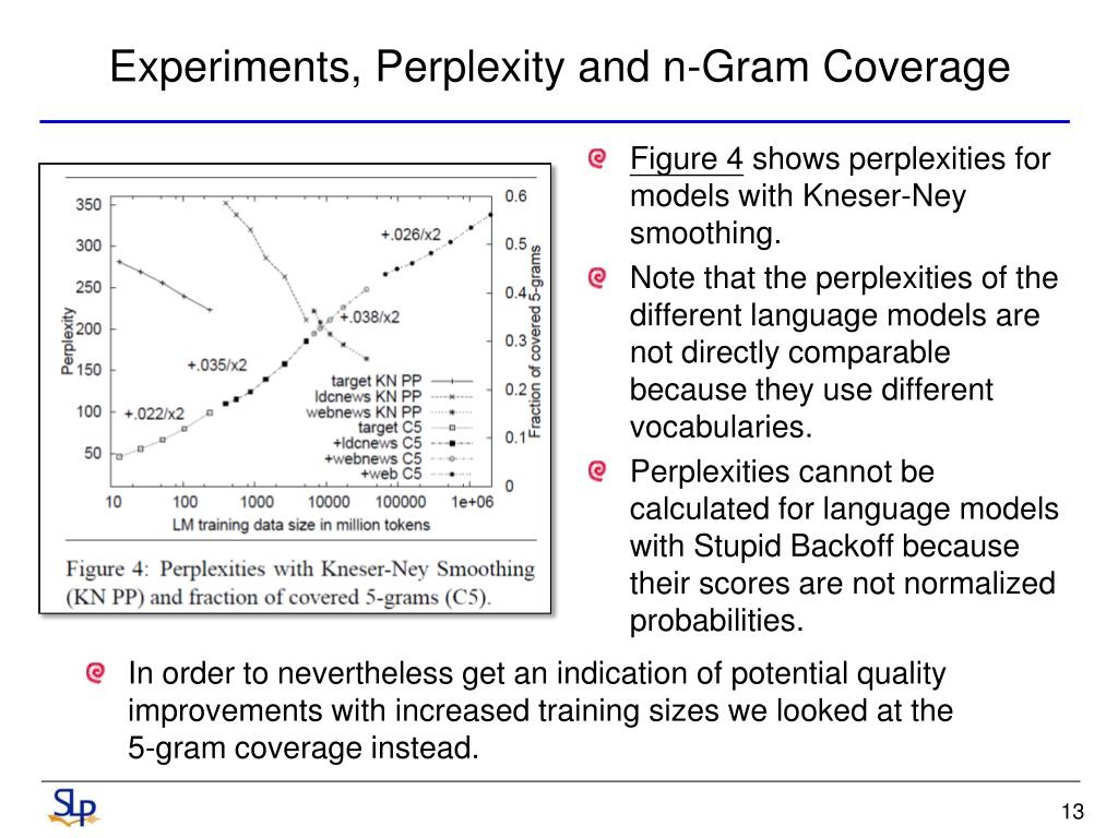 Experiments, Perplexity and n-Gram Coverage • Figure 4 shows perplexities for models with Kneser-Ney smoothing. • Note that the perplexities of the different language models are not directly comparable because they use different vocabularies. • Perplexities cannot be calculated for language models with Stupid Backoff because their scores are not normalized probabilities. In order to nevertheless get an indication of potential quality improvements with increased training sizes we looked at the 5-gram coverage instead.