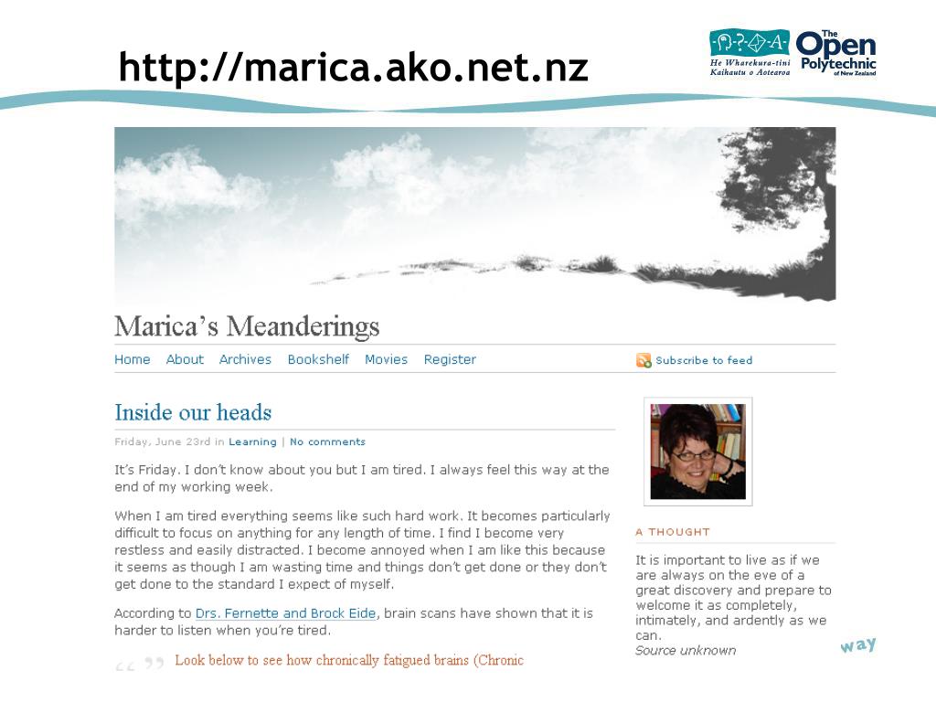 Weblogs as dynamic learning spaces. Marica Ševelj | 3 July 2006. Distance learning is perceived and experienced by many as a lonely way to learn. http://elgg.net/dtosh/weblog/398.html. Blogging geyser.
