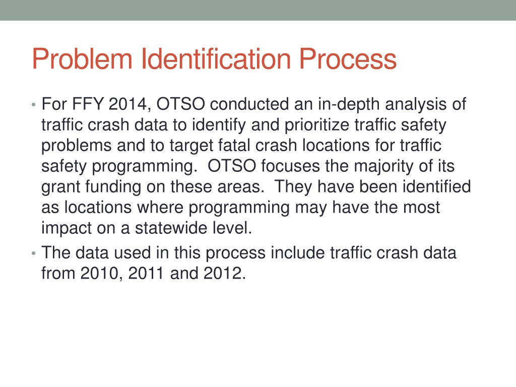 Problem Identification Process • For FFY 2014, OTSO conducted an in-depth analysis of traffic crash data to identify and prioritize traffic safety problems and to target fatal crash locations for traffic safety programming. OTSO focuses the majority of its grant funding on these areas. They have been identified as locations where programming may have the most impact on a statewide level. • The data used in this process include traffic crash data from 2010, 2011 and 2012.