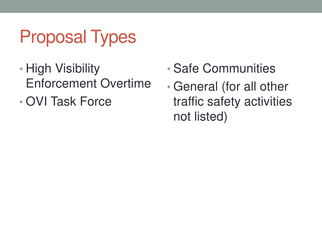 Proposal Types • High Visibility Enforcement Overtime • OVI Task Force • Safe Communities • General (for all other traffic safety activities not listed)