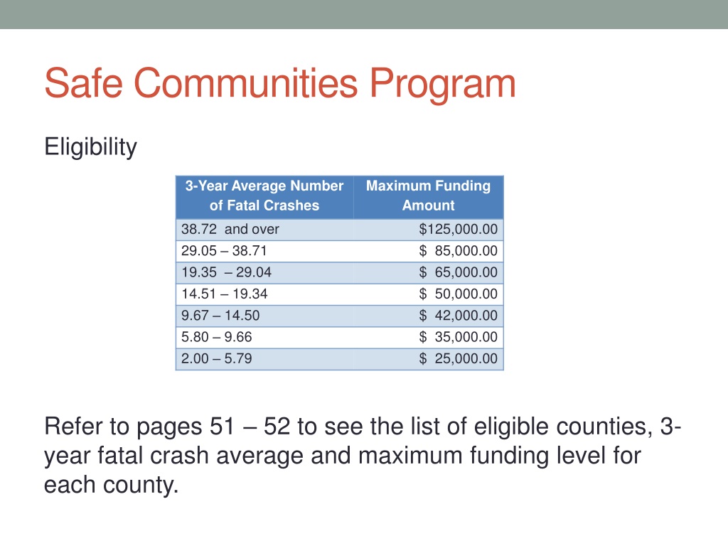 Safe Communities Program Eligibility Refer to pages 51 – 52 to see the list of eligible counties, 3-year fatal crash average and maximum funding level for each county.