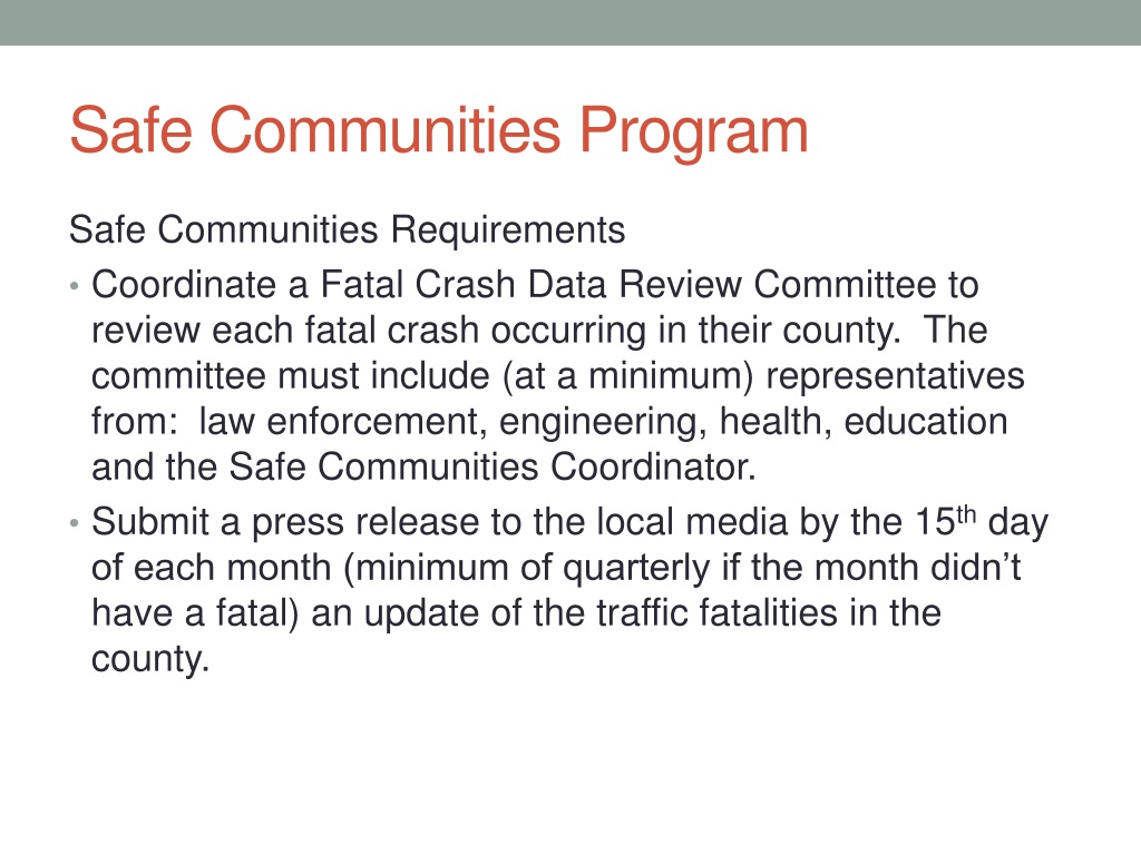 Safe Communities Program Safe Communities Requirements • Coordinate a Fatal Crash Data Review Committee to review each fatal crash occurring in their county. The committee must include (at a minimum) representatives from: law enforcement, engineering, health, education and the Safe Communities Coordinator. • Submit a press release to the local media by the 15th day of each month (minimum of quarterly if the month didn’t have a fatal) an update of the traffic fatalities in the county.