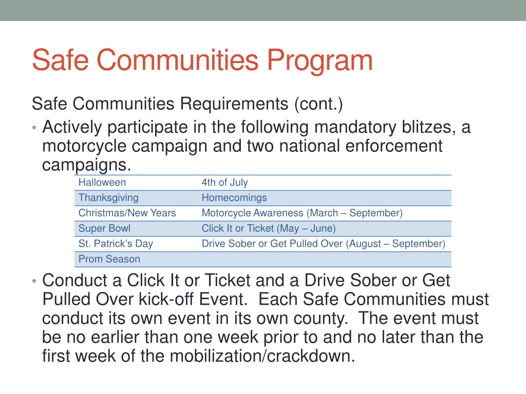 Safe Communities Program Safe Communities Requirements (cont.) • Actively participate in the following mandatory blitzes, a motorcycle campaign and two national enforcement campaigns. • Conduct a Click It or Ticket and a Drive Sober or Get Pulled Over kick-off Event. Each Safe Communities must conduct its own event in its own county. The event must be no earlier than one week prior to and no later than the first week of the mobilization/crackdown.