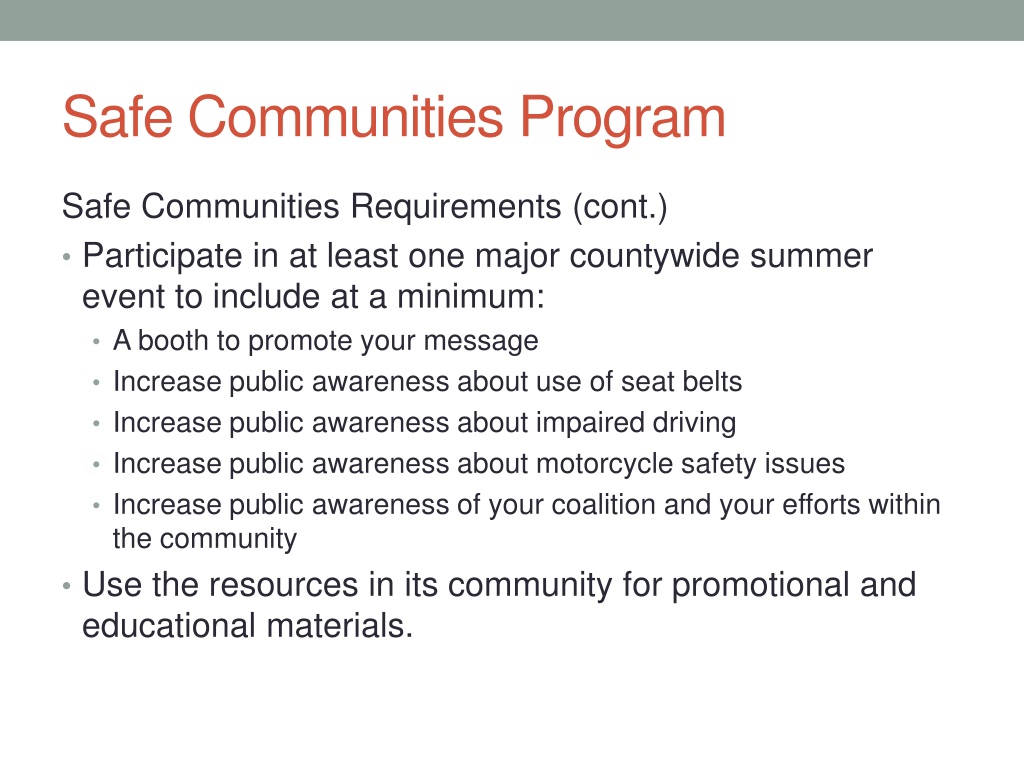 Safe Communities Program Safe Communities Requirements (cont.) • Participate in at least one major countywide summer event to include at a minimum: • A booth to promote your message • Increase public awareness about use of seat belts • Increase public awareness about impaired driving • Increase public awareness about motorcycle safety issues • Increase public awareness of your coalition and your efforts within the community • Use the resources in its community for promotional and educational materials.